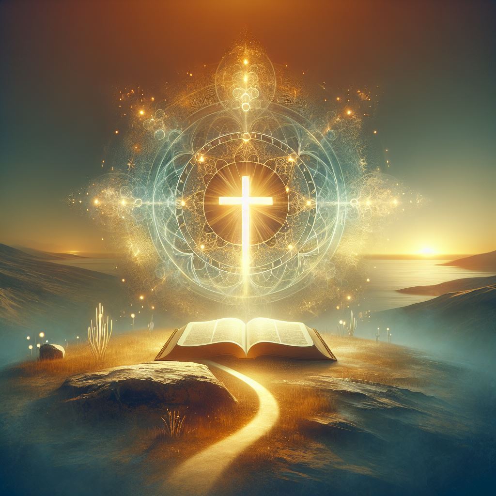 A serene landscape depicting a person standing on a hill at sunrise, arms raised in worship. The sky is painted with warm hues of gold and orange, wi